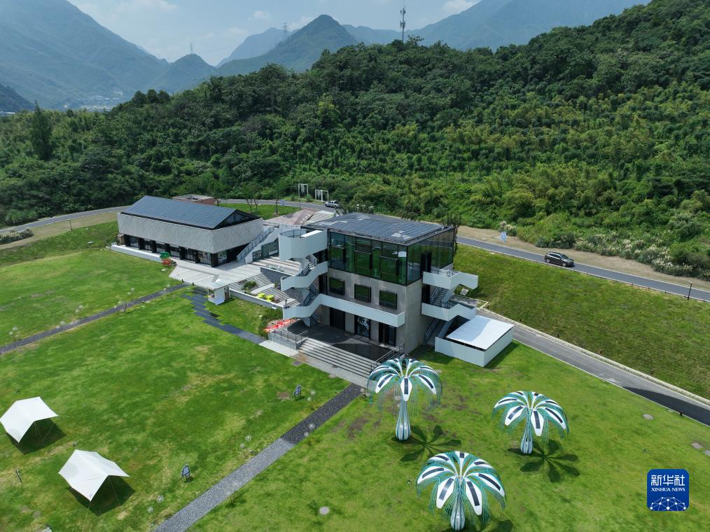 8月11日拍攝的余村未來圖書館,該建筑主要通過鋪設在屋頂上的光伏發電系統和“光伏樹”供電(無人機照片)。