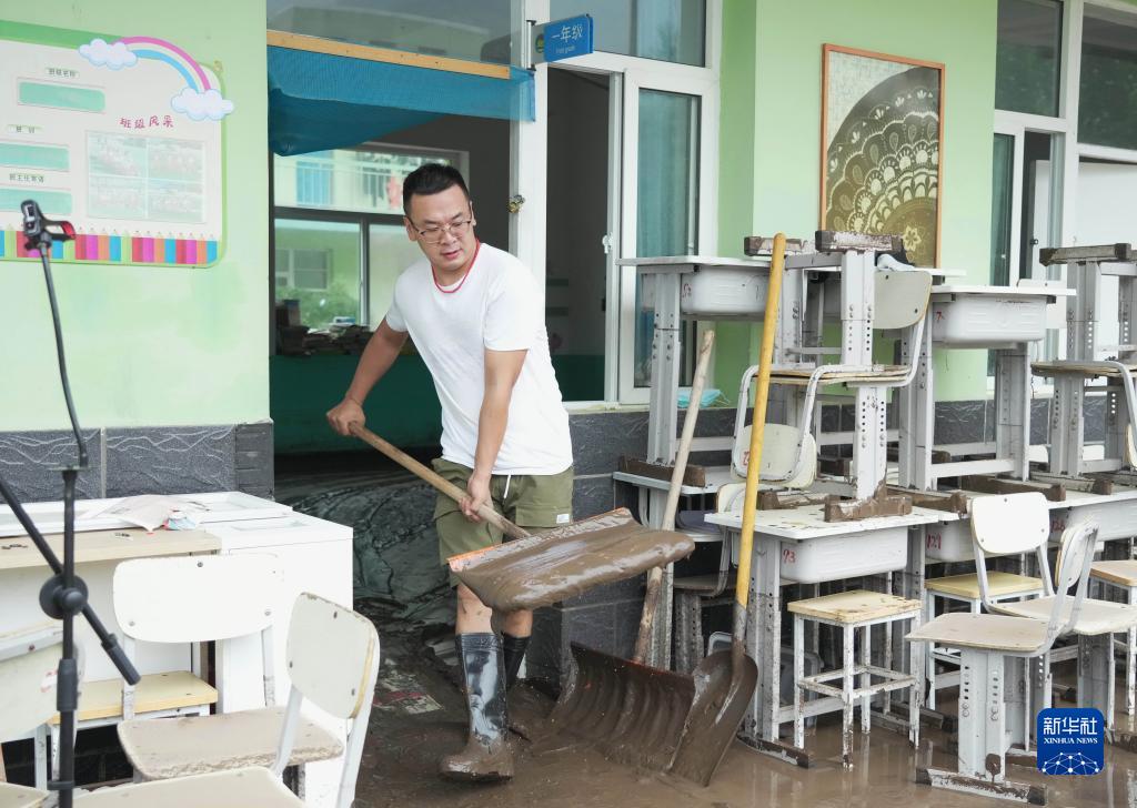 8月11日,在河北省淶水縣其中口鄉,學校老師在清理教室內的淤泥。