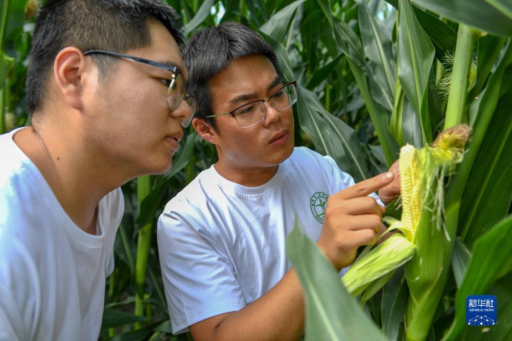7月31日,在位于吉林省四平市梨樹縣的中國農業大學“科技小院”試驗田,在讀博士生沙野(右)和在讀碩士生蔣家偉查看作物生長情況。