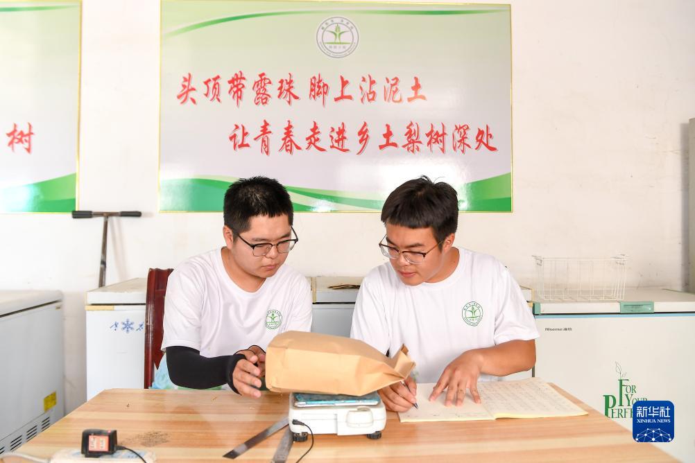 7月31日,在位于吉林省四平市梨樹縣的中國農業大學“科技小院”,在讀博士生沙野(右)和在讀碩士生蔣家偉測量作物樣本數據。