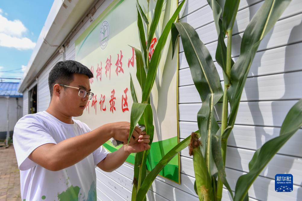 8月10日,在位于吉林省四平市梨樹縣的中國農業大學“科技小院”,在讀博士生沙野測量作物葉片葉綠素含量。