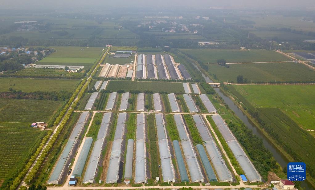 這是8月11日在山東省菏澤市定陶區杜堂鎮拍攝的一處用于蔬菜育苗的自動控溫大棚種植基地(無人機照片)。