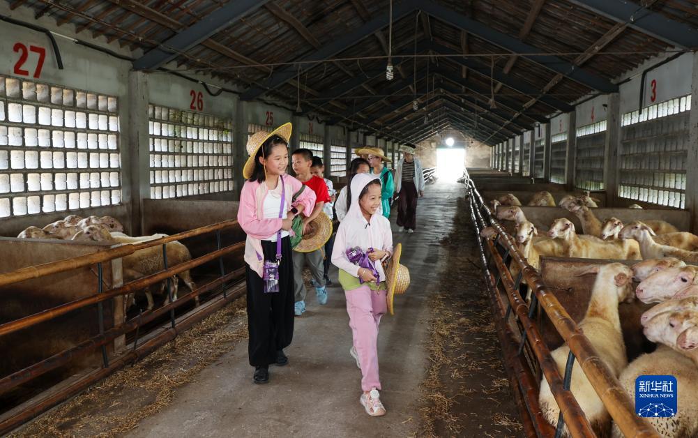 8月11日,在吳興區道場鄉錢山下糧油專業合作社,小朋友在參觀湖羊養殖基地。