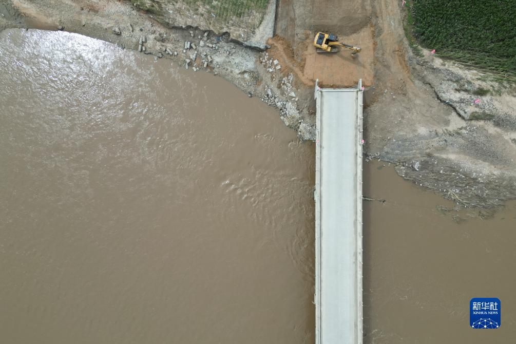 8月11日,工作人員在黑龍江省尚志市馬延鄉馬延大橋搶修現場進行施工作業(無人機照片)。