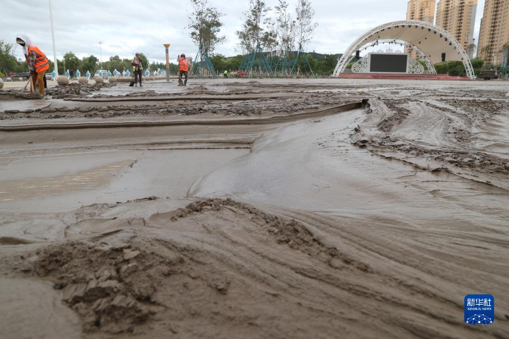 8月11日,在黑龍江省尚志市尚志大街附近,環衛工人在清理淤泥。