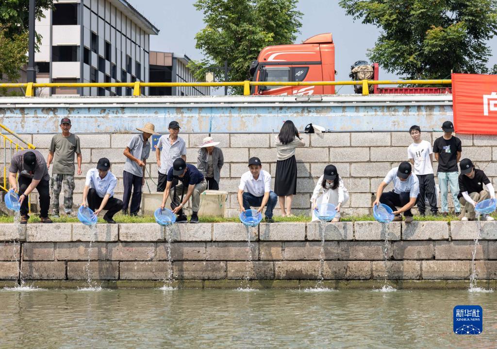 8月11日,在浙江省湖州市吳興高新區幻溇村,志愿者與村民在放流魚苗。