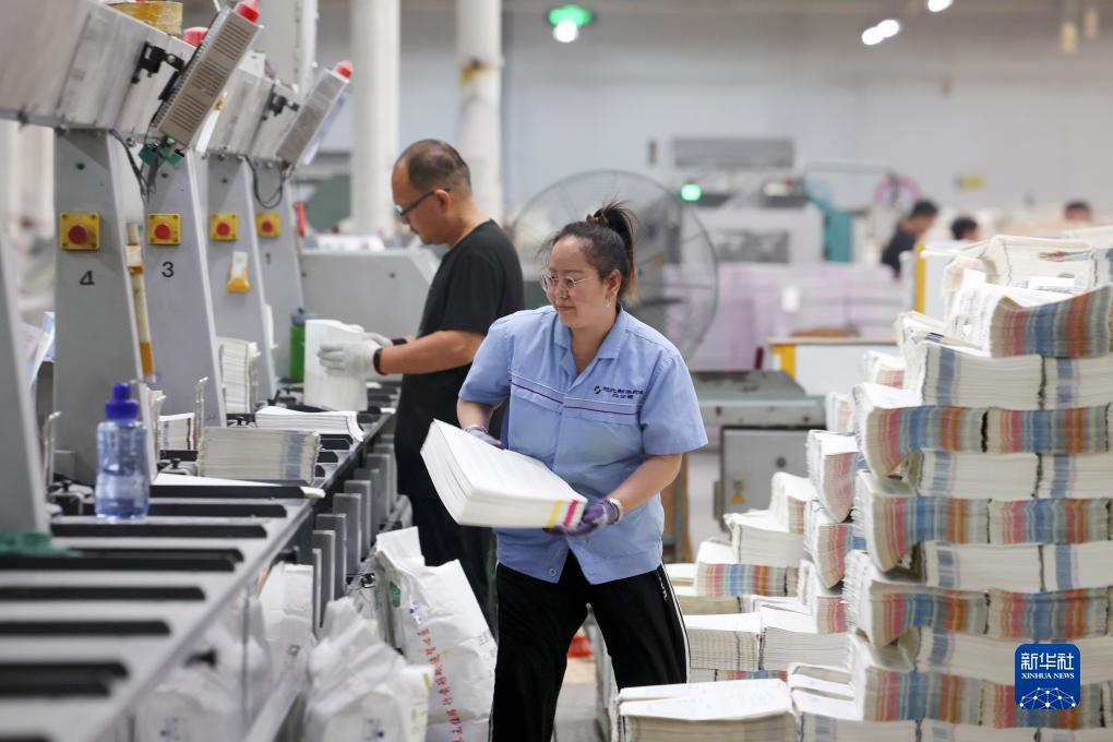 8月11日,在位于石家莊的河北新華第二印刷有限責任公司,工人在進行教材裝訂工作。