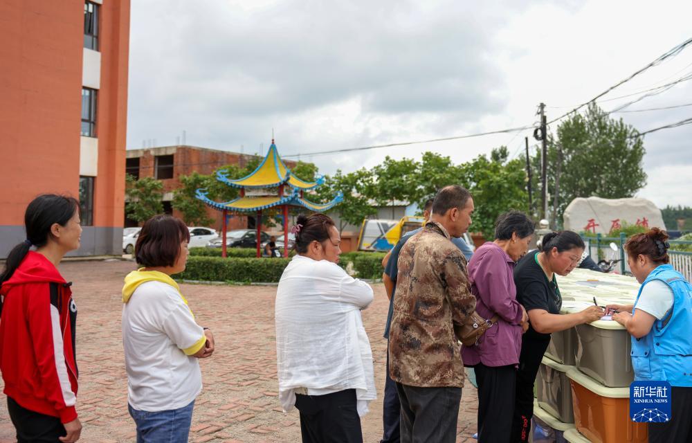 8月10日,居民在吉林省舒蘭市開原鎮上的舒蘭中心校居民安置點申領生活用品。