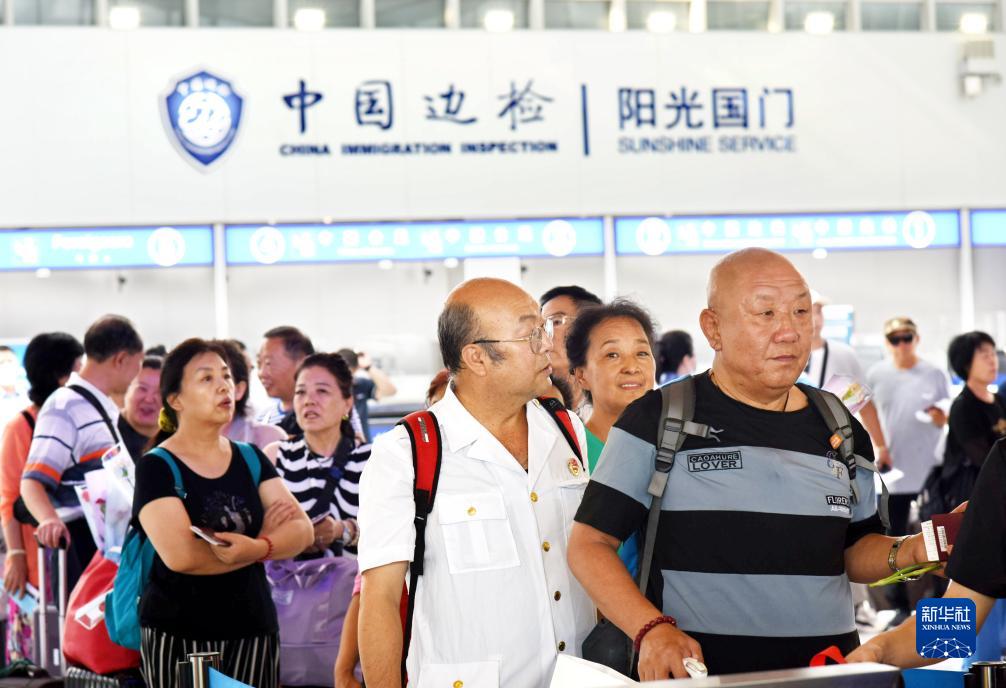 8月11日,旅客在青島郵輪母港客運碼頭排隊辦理邊檢出境手續。