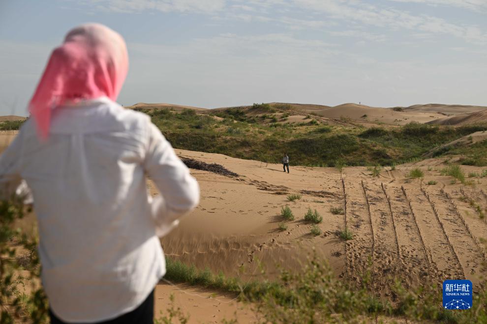 8月11日,工人在達拉特旗境內的庫布其沙漠中拉線,準備栽植沙障。