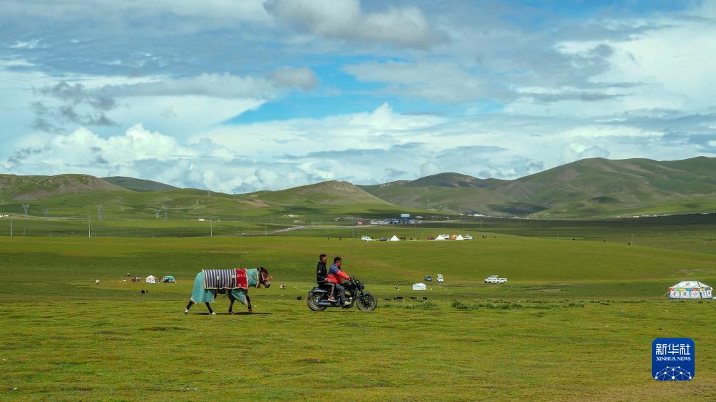 8月11日,馴馬人騎摩托車在羌塘草原上遛馬。
