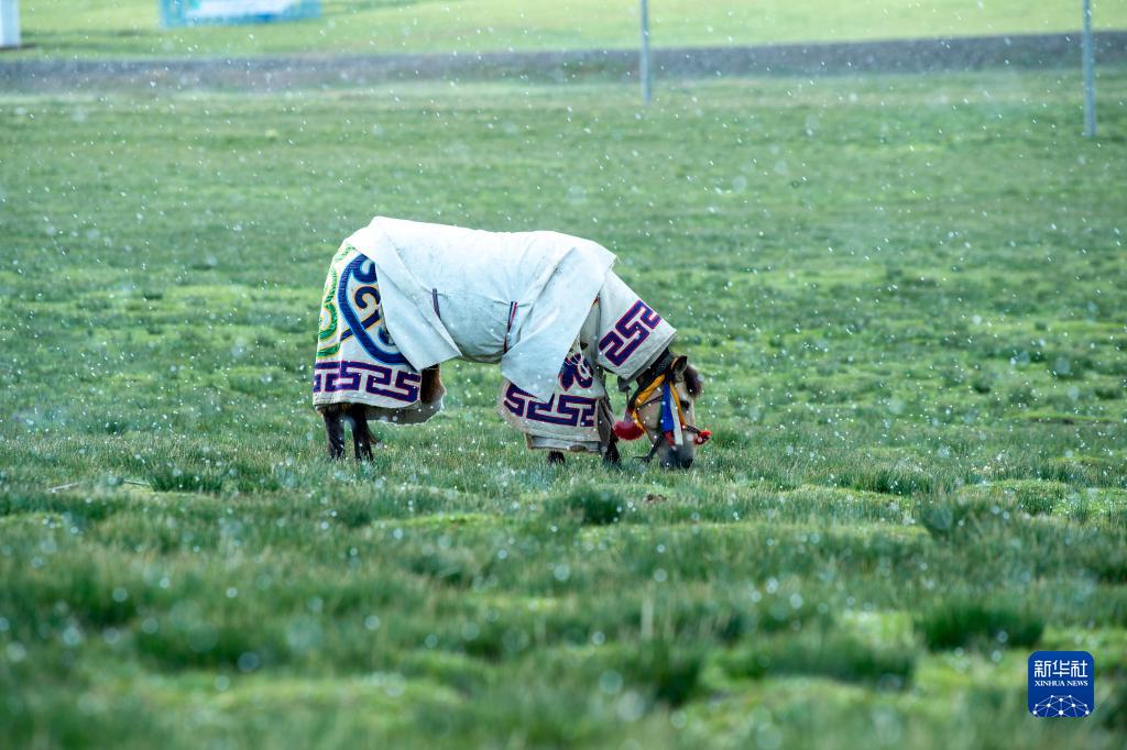 “隆達熱巴”在雨中吃草,次扎達給它穿上了厚厚的“衣服”(8月9日攝)。