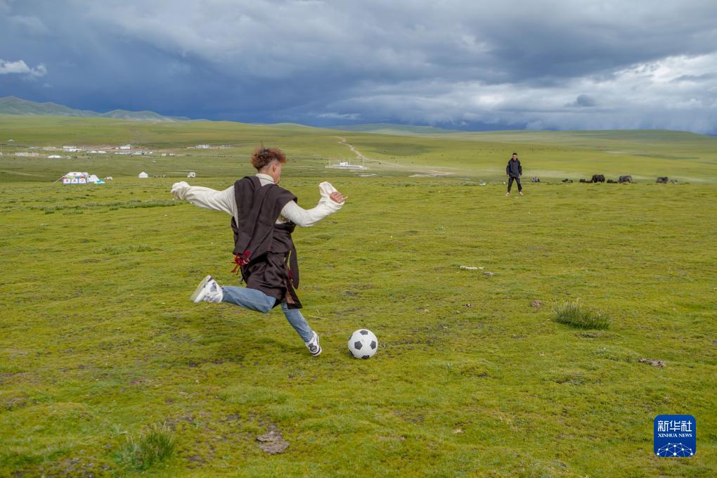 8月11日,旦增旺久和朋友在草原上踢足球。旦增旺久是次扎達兒子列熱覺旦的表哥,遠在千里之外的湖南上學,但還會經常想起“隆達熱巴”。正值暑假,回到草原的他會細心地為“隆達熱巴”梳毛,跟它說悄悄話。