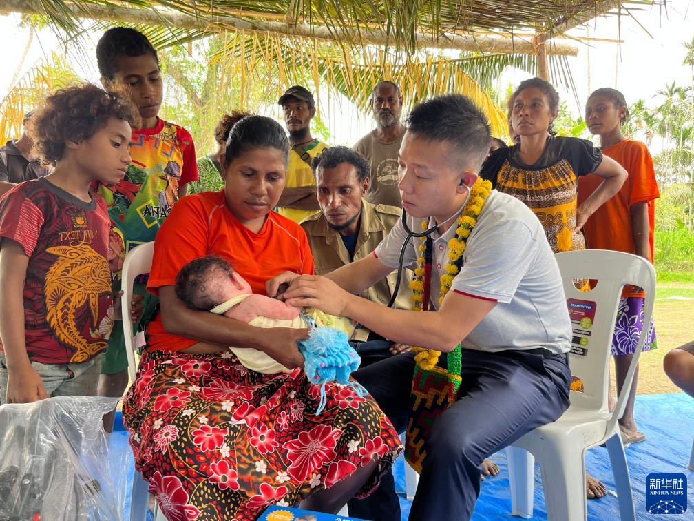 8月5日,在巴布亞新幾內亞中央省的一個村莊里,第12批援巴新中國醫療隊副隊長、新生兒科副主任醫師劉振球為泰樂聽診檢查。