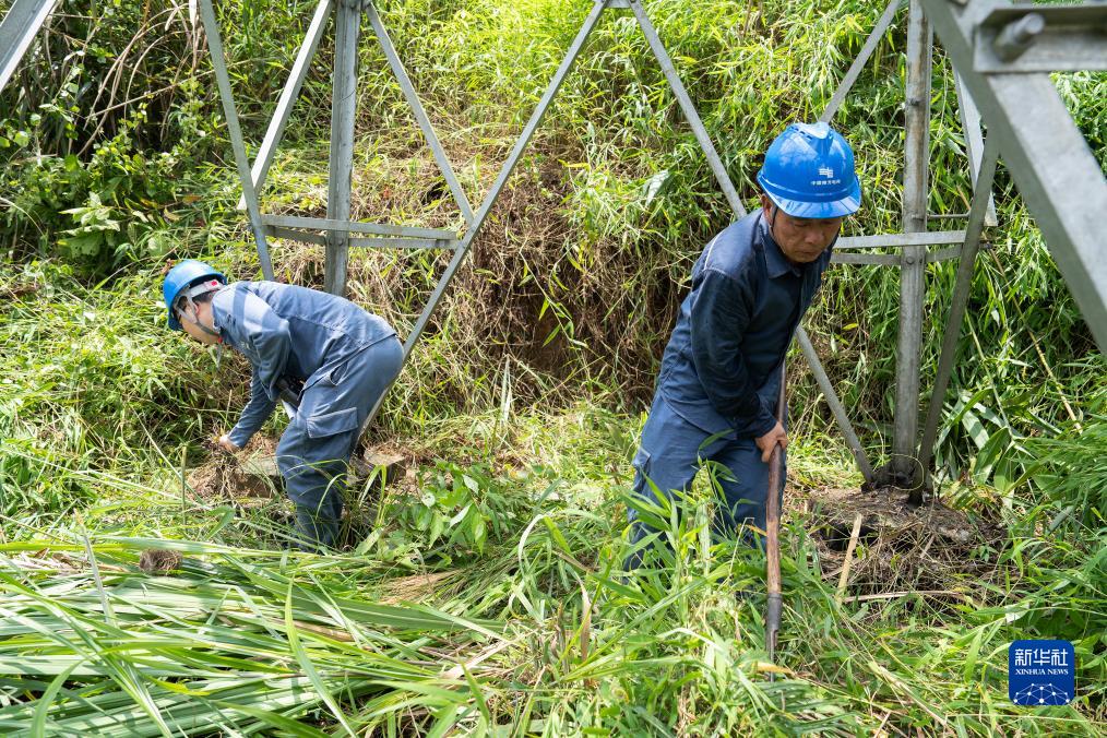 8月10日,鄧一強(右)和姚證強在清理10千伏浦寨Ⅱ線19號塔塔基附近的雜草,查看塔基的情況。新華社記者 費茂華 攝