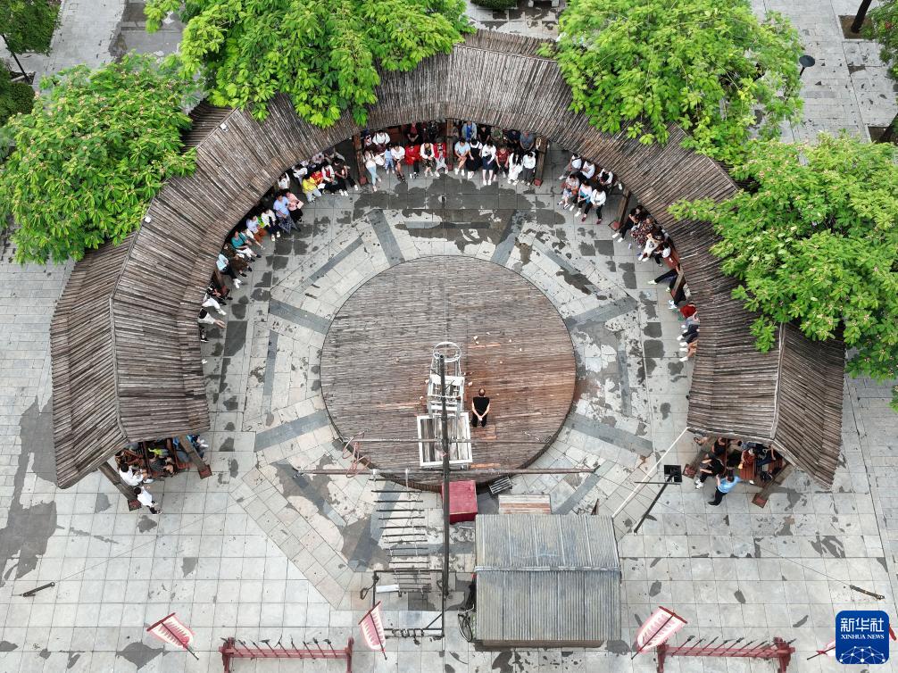 8月12日,在河北省滄州市吳橋雜技大世界景區江湖文化城,游客們觀看雜技藝人表演傳統雜技節目(無人機照片)。