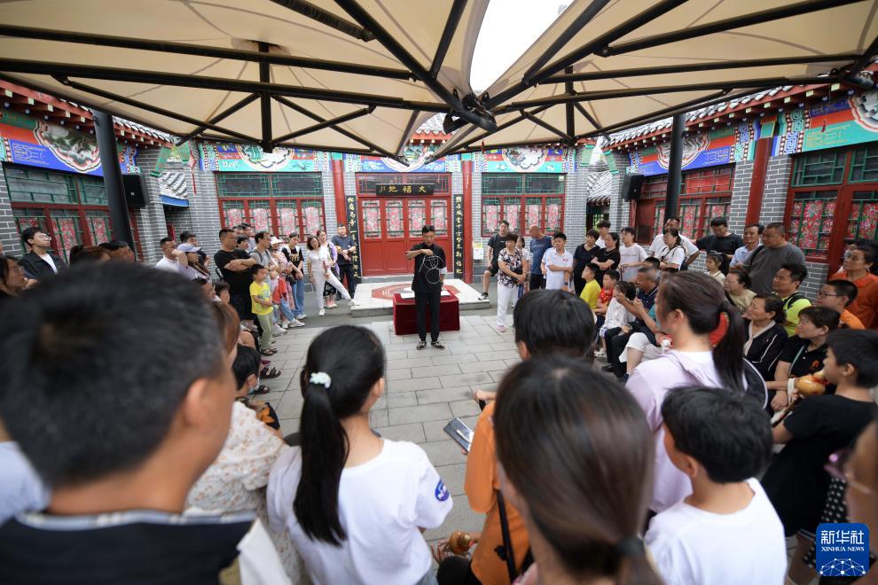 8月12日,在河北省滄州市吳橋雜技大世界景區江湖文化城,游客們觀看雜技藝人表演傳統雜技節目。