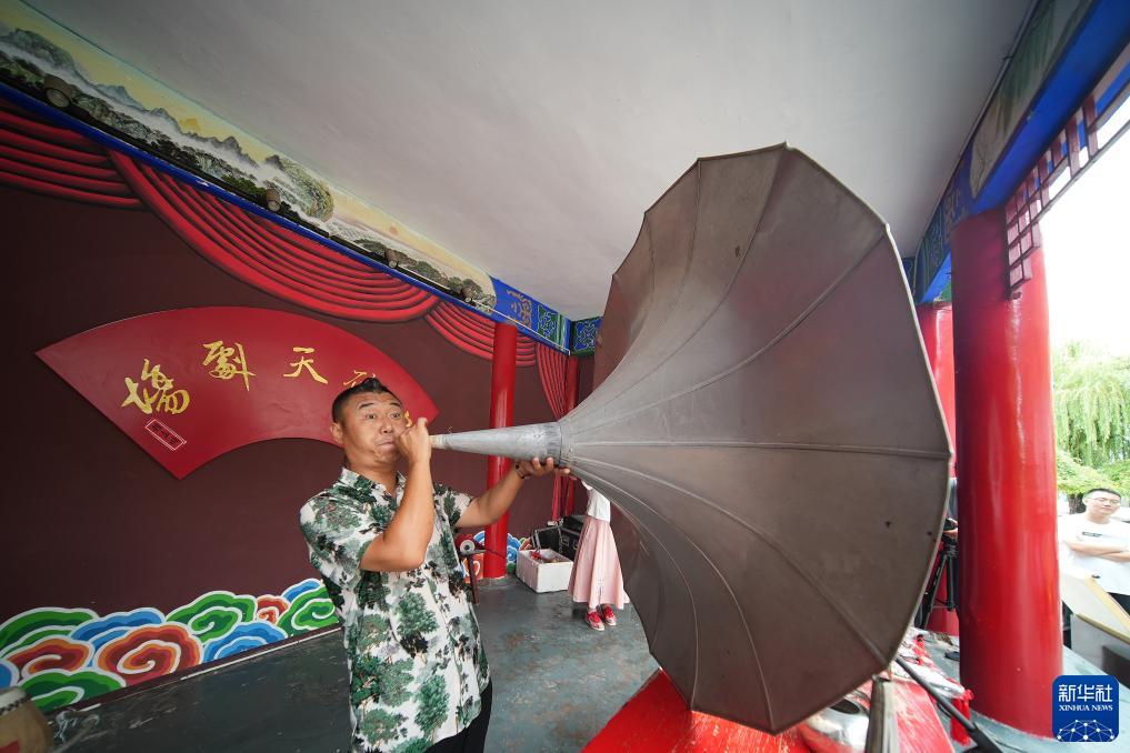 8月12日,在河北省滄州市吳橋雜技大世界景區江湖文化城吹破天劇場,雜技藝人表演吹嗩吶。