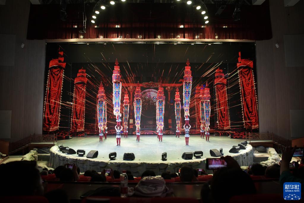 8月12日,在河北省滄州市吳橋縣江湖大劇院,游客們觀看雜技表演。