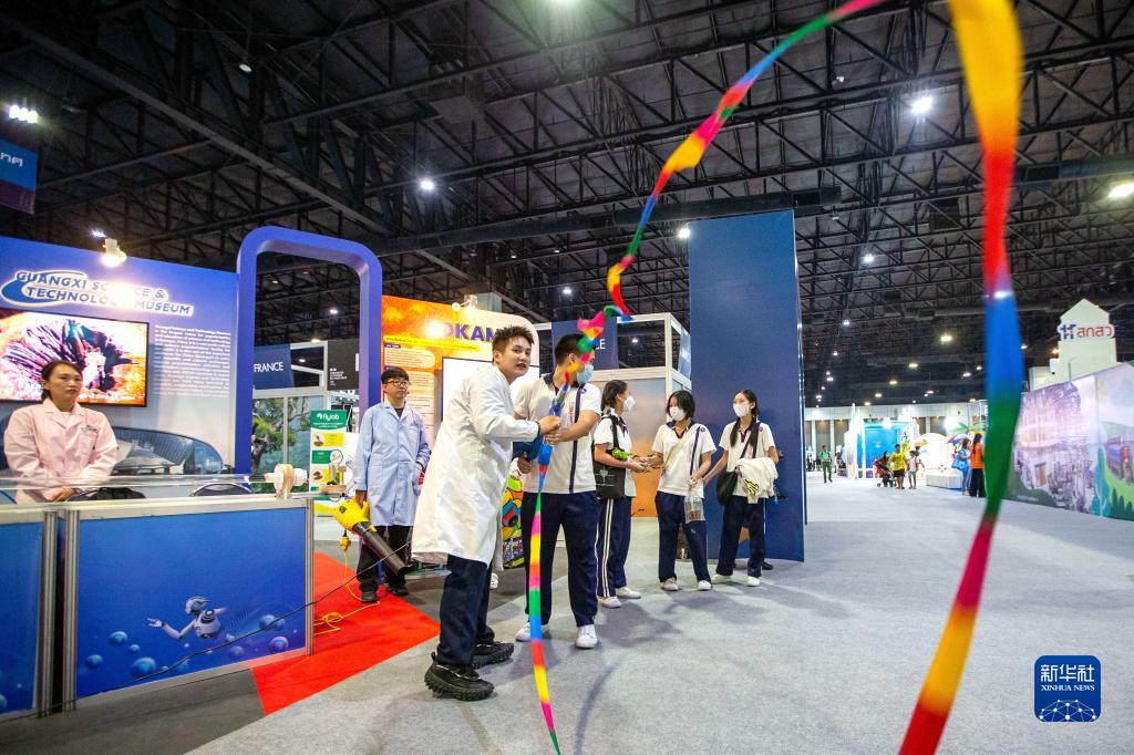 8月11日,在泰國曼谷舉辦的泰國國家科學技術展上,參觀者在中國館觀看彩帶槍實驗。