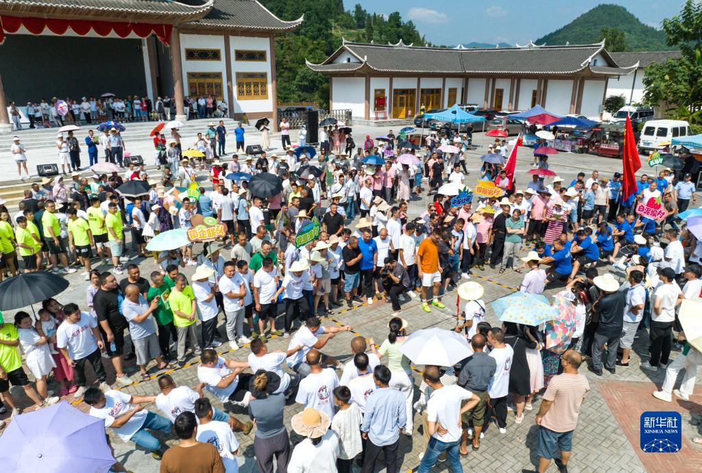 8月12日,人們在宣恩縣椒園鎮黃坪村的景區趣味運動會上參加拔河比賽(無人機照片)。