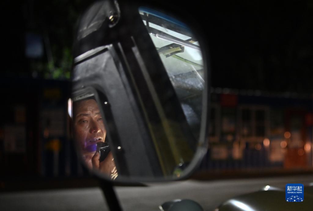 郝慶水在車內用對講機安排抗洪工作(8月3日攝)。