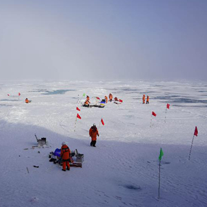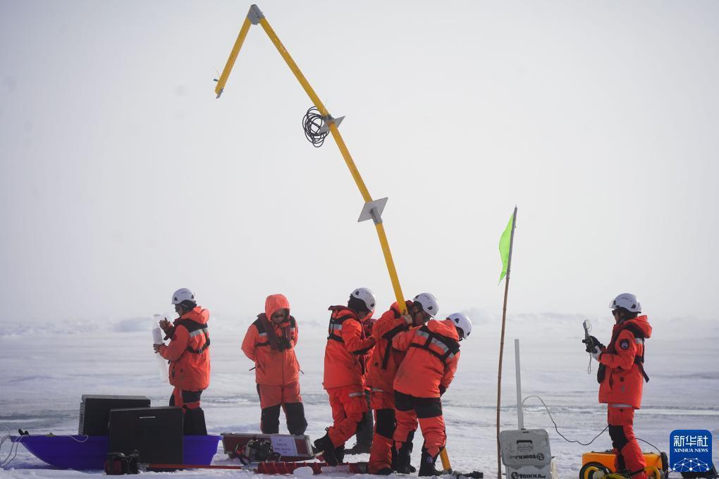 8月12日,科考隊員在布放海冰物質平衡浮標。