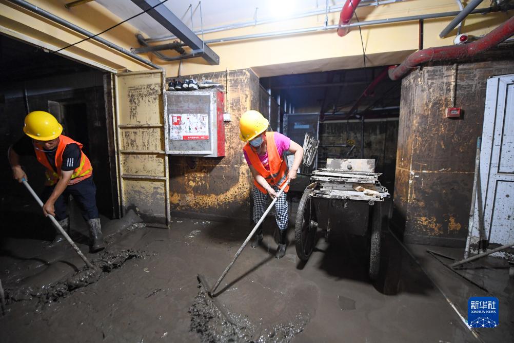 8月12日,在北京市門頭溝區醫院,因水災影響無法從事原本工作的受災群眾組成清淤隊伍,清理醫院地下室的淤泥和垃圾。新華社記者 鞠煥宗 攝