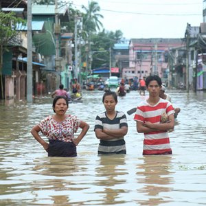 8月12日,人們在緬甸勃固鎮被水淹沒的道路上涉水前行。