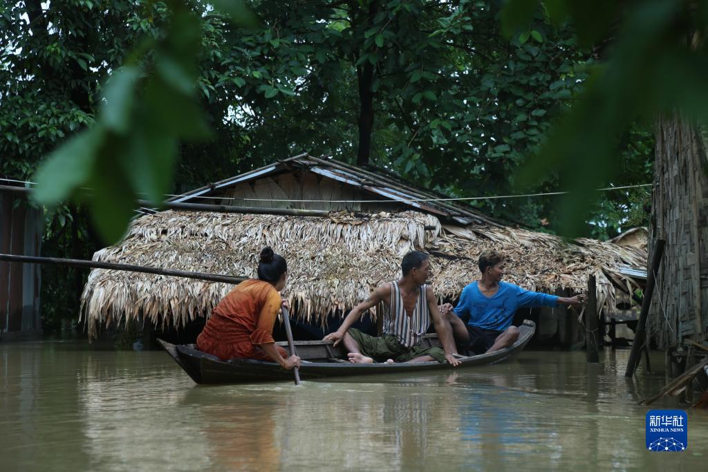 8月12日,在緬甸勃固鎮洪災區,人們乘船出行。新華社發(苗覺梭攝)
