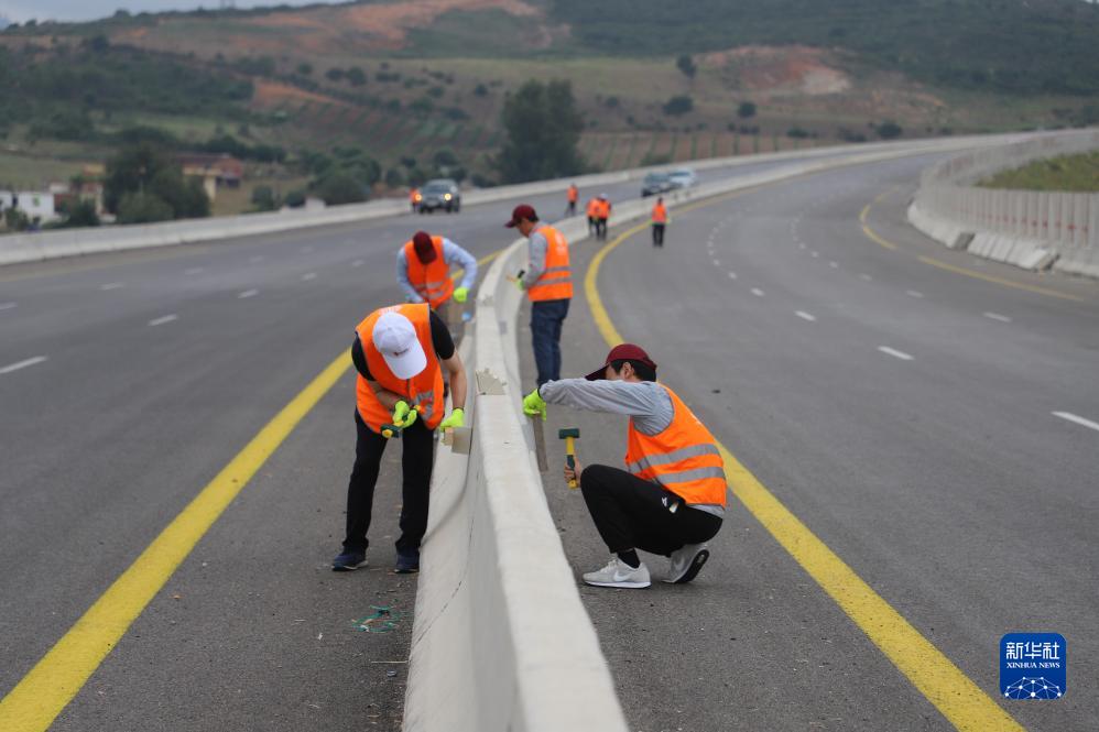 7月1日,在阿爾及利亞塔夫省,施工人員為阿爾及利亞東西高速公路84公里項目通車做準備。