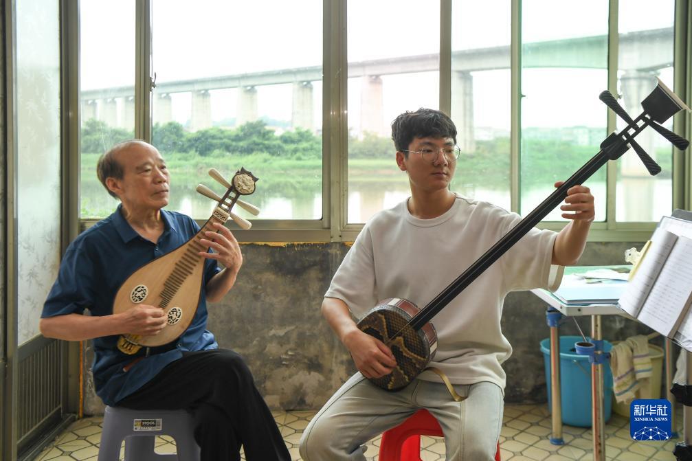 8月12日,李舒尤(左)在枧頭洲村舒尤樂坊和來探望他的學生湯梁彪一起合奏。在李舒尤的指導下,湯梁彪考上了西安音樂學院,他每年假期都會探望李舒尤。