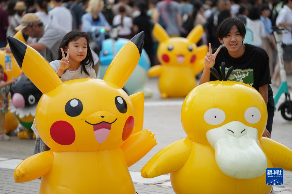 8月13日,人們在日本橫濱未來港紅磚倉庫前同充氣卡通形象合影。