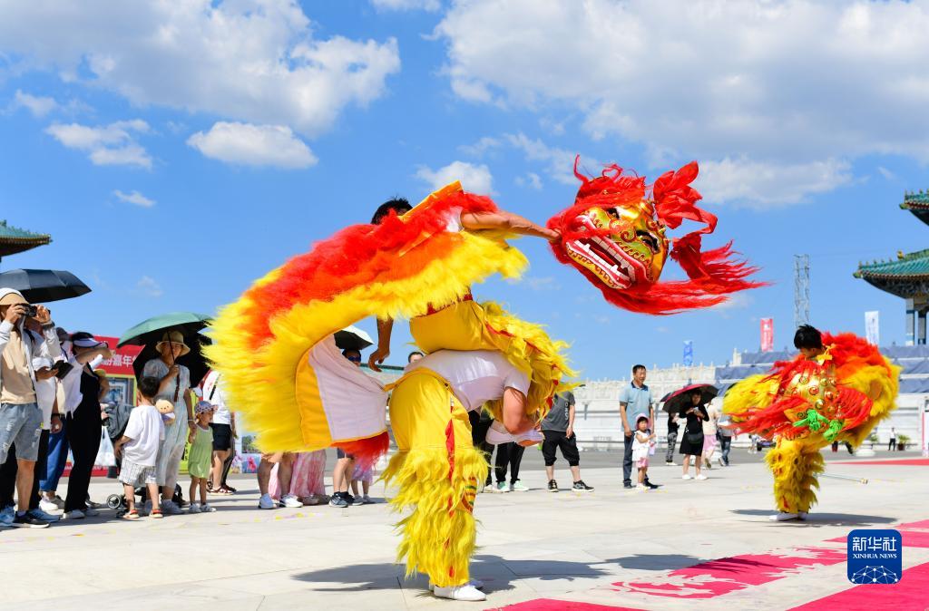 8月13日,在鄂爾多斯文化產業園景區,民間藝人表演舞獅。