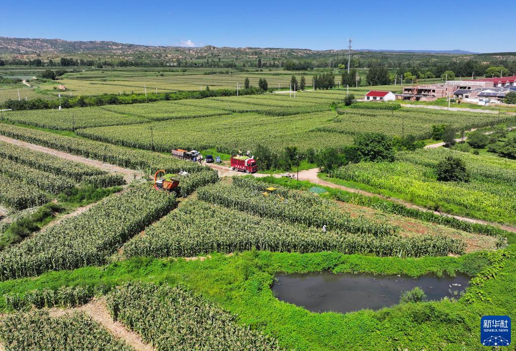 8月13日,在張家口市萬全區盆窯村鮮食玉米種植基地,農民收獲鮮食玉米(無人機照片)。
