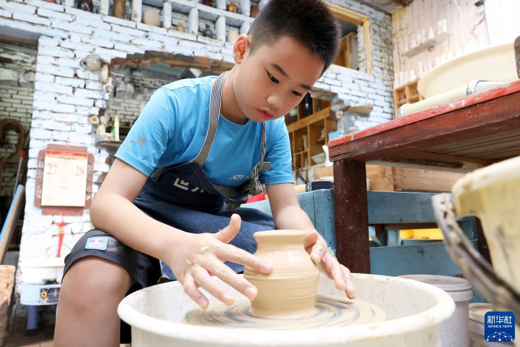 8月13日,小學生在福建省福州市長樂區吳村村陶源里文創街區學習制作陶藝作品。
