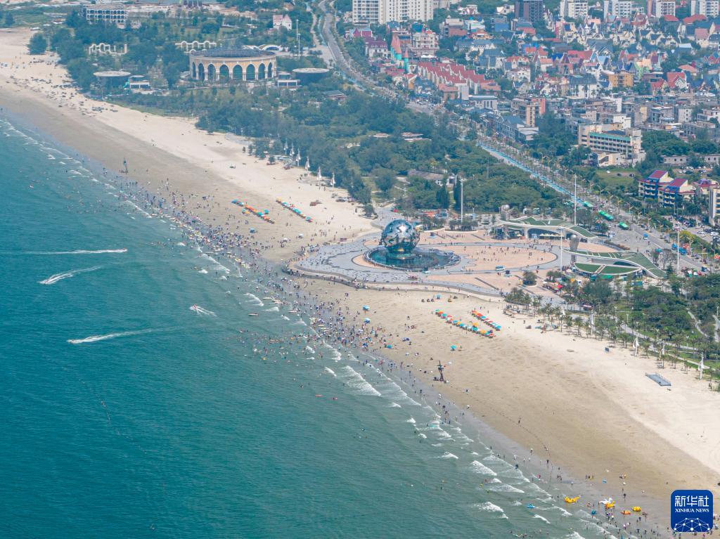 8月13日,游客在廣西北海銀灘游玩(無人機照片)。