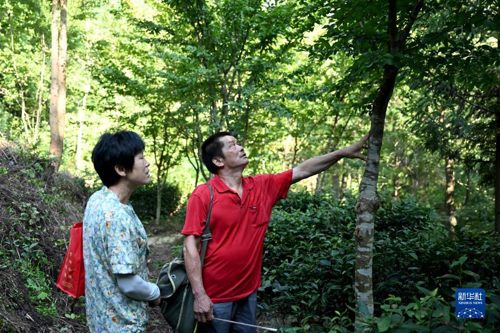 8月12日,在安徽天馬國家級自然保護區天堂寨管理站,王克東和高開玉查看自己親手栽種的國家一級保護植物銀縷梅的生長情況。