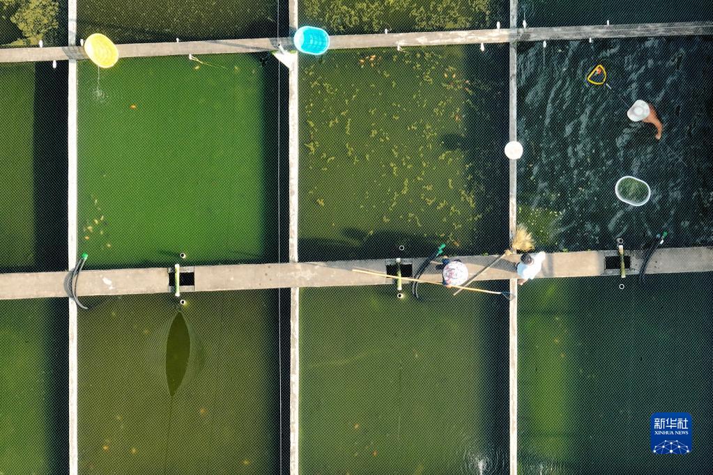 在福州市閩侯縣南通鎮古城村春園鯉生態養殖場,養殖戶們在養殖池里挑選金魚(8月9日攝,無人機照片)。