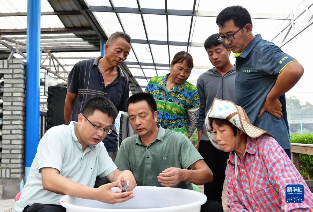 在福州市閩侯縣南通鎮古城村春園鯉生態養殖場,科技特派員、福建師范大學生命科學學院博士黃鎮(左一)在給古城村養殖戶們傳授金魚選種育種技術(8月9日攝)。
