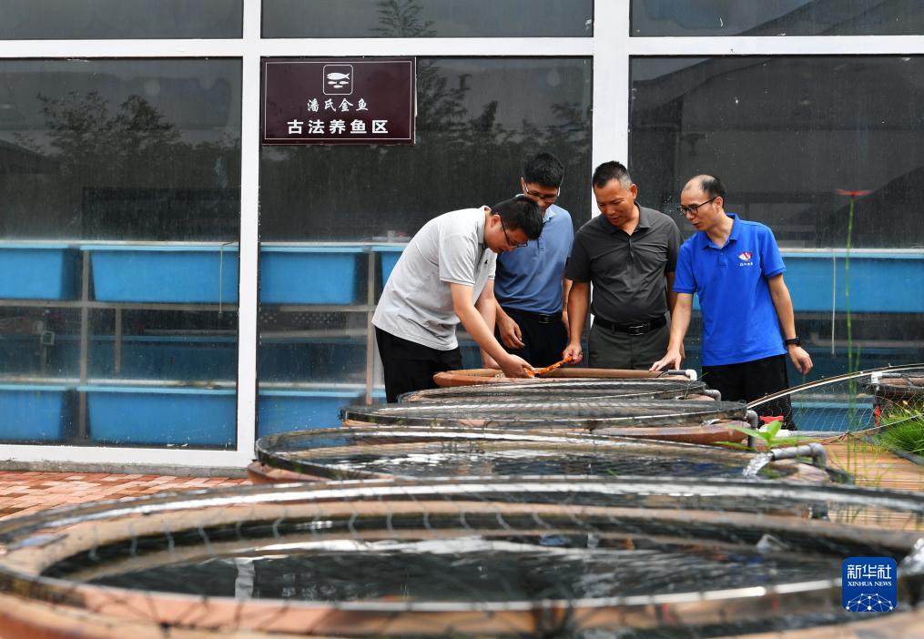 這是在福州市閩侯縣荊溪鎮關中村潘氏金魚養殖基地,福建省科技廳、福州市科技局選派的科技特派員團隊與養殖場負責人潘國誠(右二)在養殖場里探討金魚養殖技術(8月11日攝)。