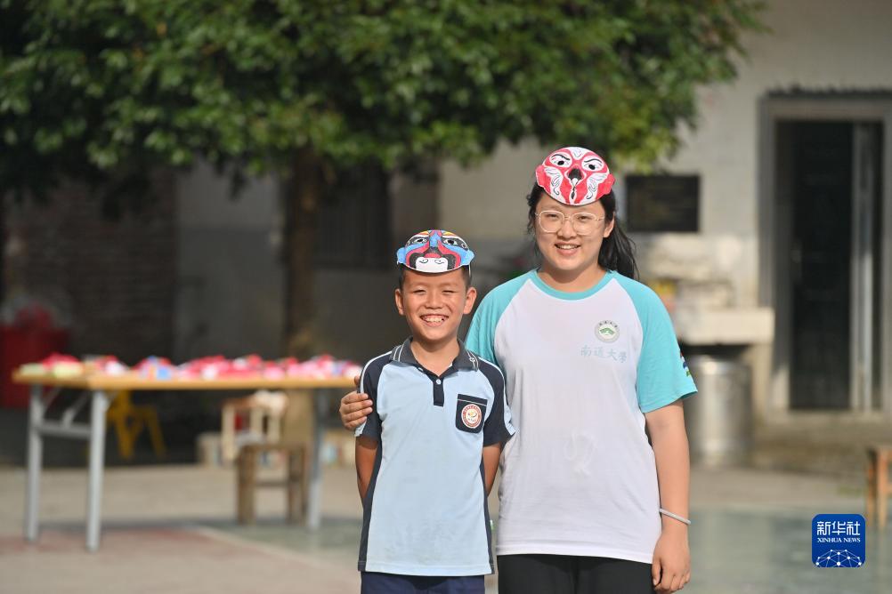 在廣西三江侗族自治縣獨峒鎮知了小學,南通大學學生呂寶鳳(右)和小學生在展示臉譜作品(7月14日攝)。