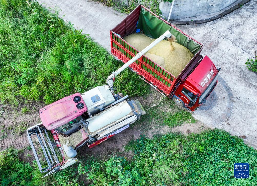8月13日,在永川區吉安鎮金門村,收割機將稻谷轉運至裝谷車內(無人機照片)。