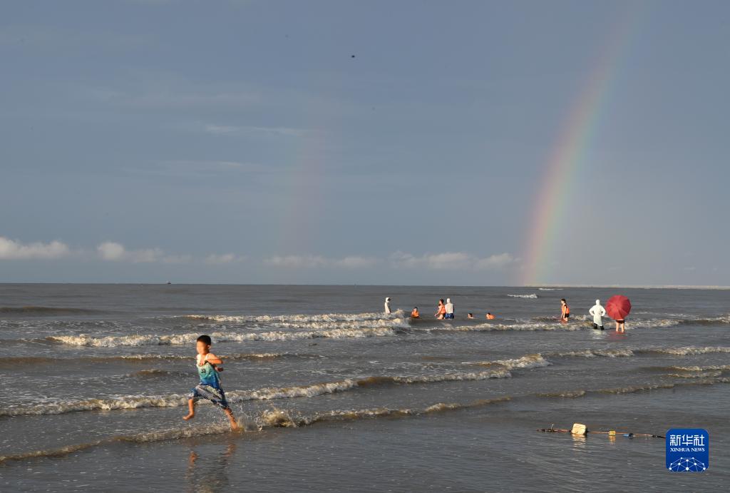 當日,一場晨雨過后,日出時分,在廣西東興的金灘,“國道之行 從雪山奔向大?!眻蟮澜M偶遇了朝陽與彩虹“共舞”的奇妙景觀。