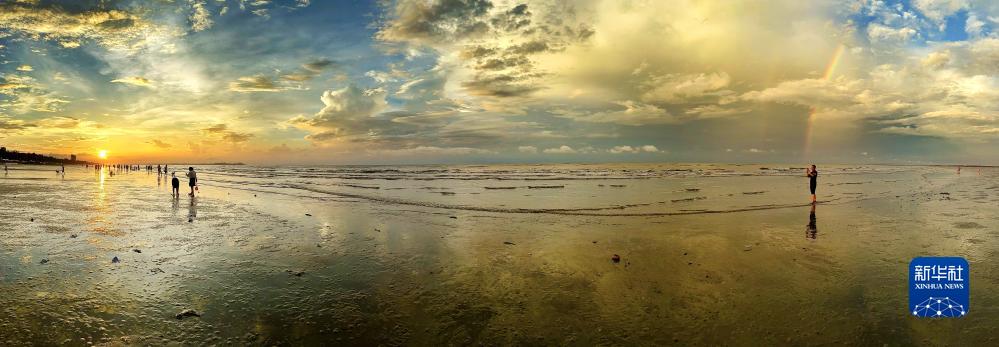 8月14日,日出時分,游客在金灘出現的彩虹下游玩(手機全景圖片)。