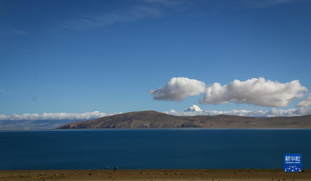 岡仁波齊峰和湖水交相輝映(8月13日攝)。