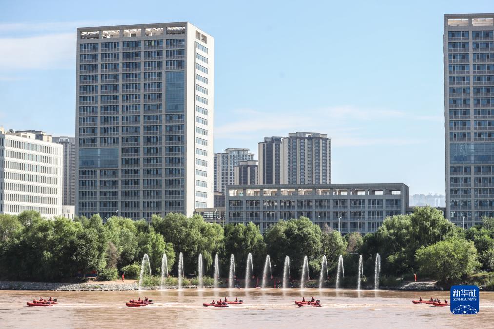 8月14日,參演隊員在黃河蘭州段奧體中心附近水域開展水域救援實戰化演練。