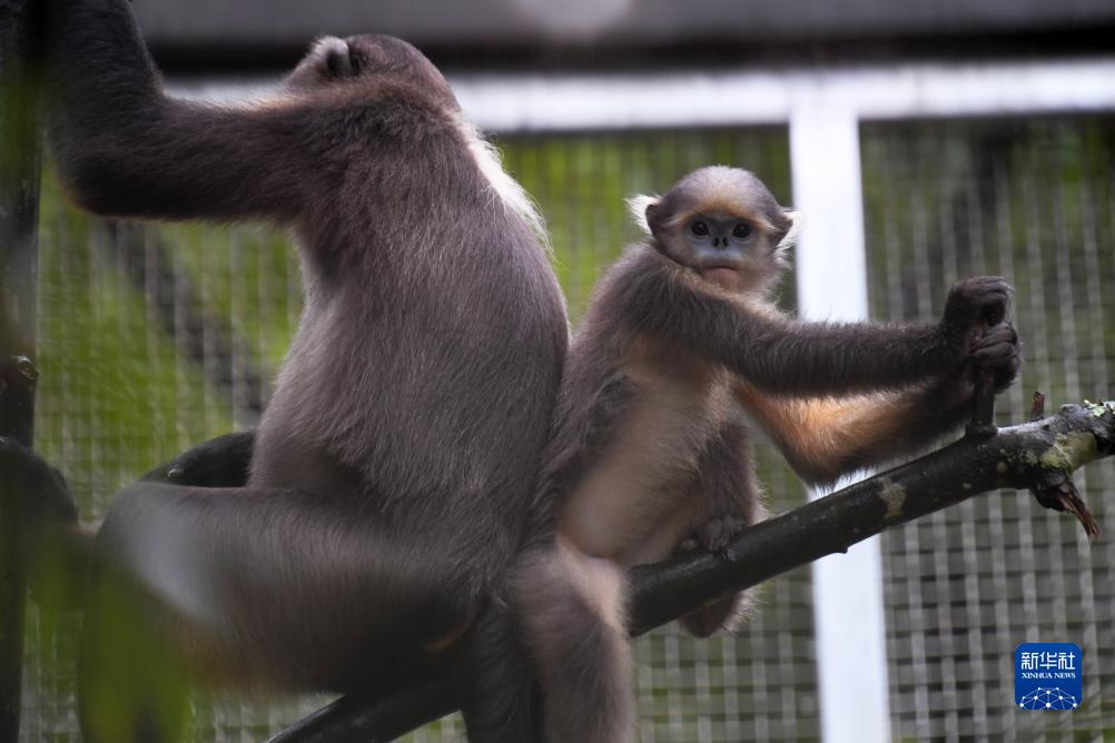 8月14日,兩只黔金絲猴在梵凈山野生動物救護中心嬉戲。