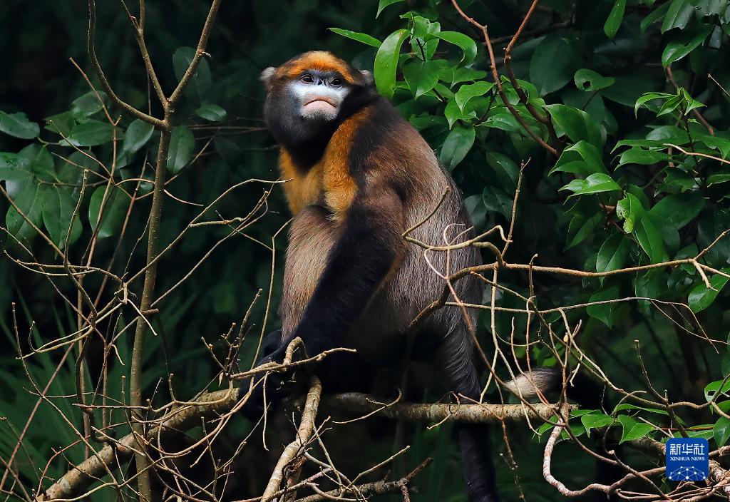 一只黔金絲猴在梵凈山密林中休憩(2022年11月19日攝)。