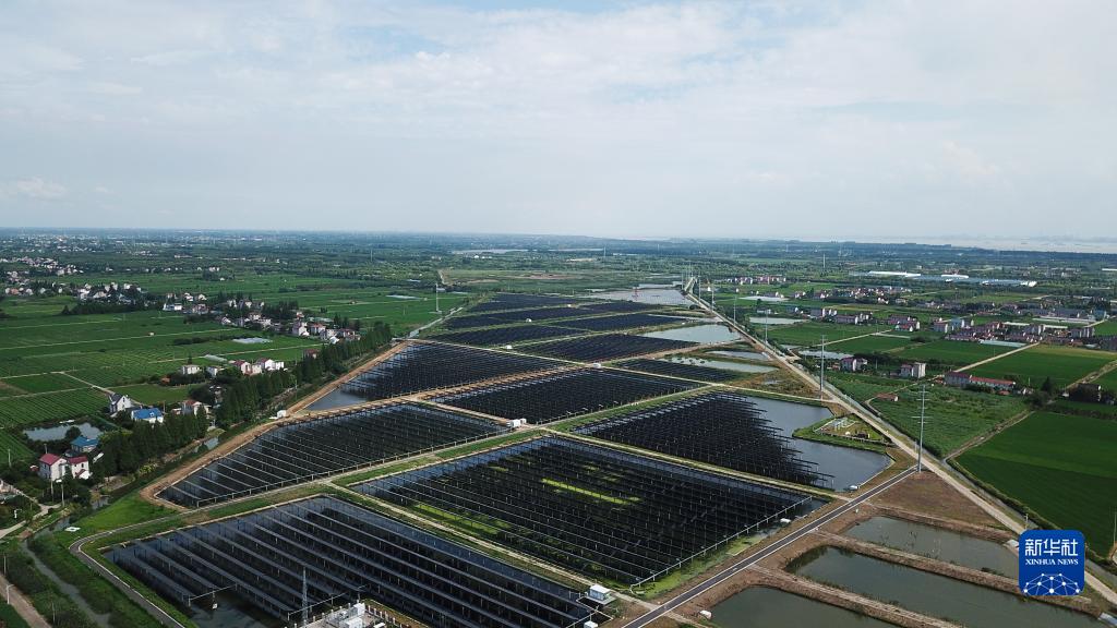 崇明綠華鎮華星村千畝蟹塘的水面上覆蓋著連片的太陽能光伏板(2023年7月25日攝,無人機照片)。